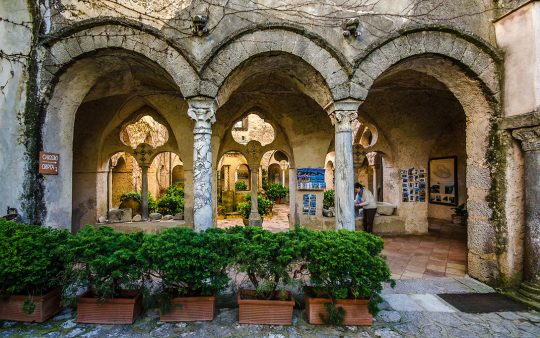 The town of Ravello is located on a steep cliff above sea level and enjoys a panoramic view of the Thyrrenian Sea and the Gulf of Salerno. Of particular interest is the Cathedral, built in 1087 and home to one of the most important bronze doors in Italy,and dedicated to St.Pantaleone,whose dried blood is contained in a rich ampulla.